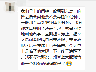 这让我想到自己小时候的情景,我的妈妈也总是很温柔,轻轻摸着我的脸小声唤着‘要迟到啦’,结果总是叫了很久才叫醒我,我却总是埋怨妈妈怎么不早点叫醒自己。如今这纠结又轮到了我身上。”