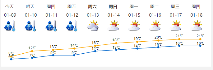 市气象台预测, 10~12日,渐转晴天,空气干燥,早晚寒冷,最低气温为9℃~10℃,最高气温13℃~17℃。