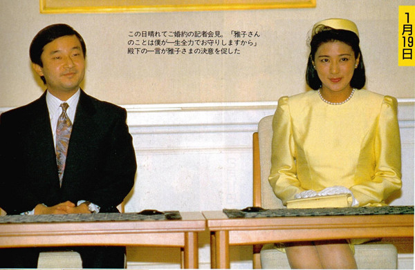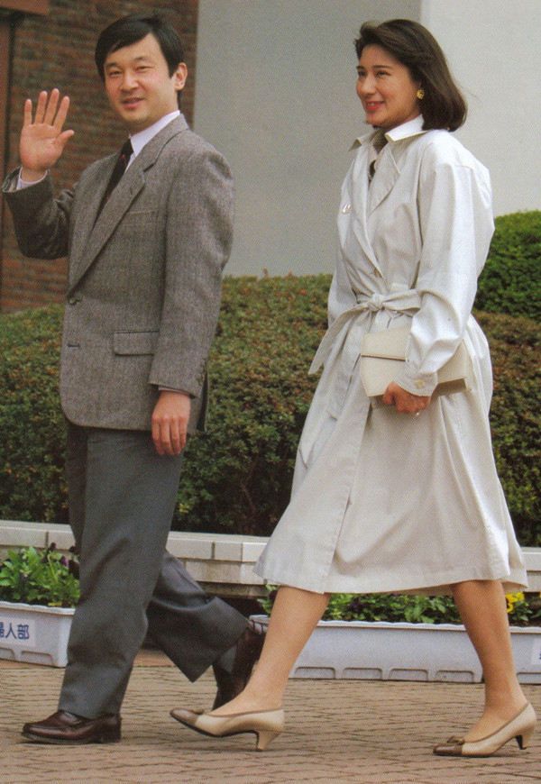 记得当年在新闻杂志上看到名字和相片的候补亲王妃,好像有三四个吧。但是,一九八〇年代日本,跟格林兄弟时代的欧洲可不同,听到王子找对象,大多人不是踊跃参加宫廷舞会,反之要逃之遥遥的,不外是大家认为,嫁入了皇室,麻烦苦头该多于乐趣甜头所致。所以,嫁的嫁,出国的出国,最后被堵住的就是父女两代的外交官小和田雅子,估计给上官劝说了:好好考虑国家利益吧。据报道,她和德仁亲王是一九八六年在访问日本的西班牙王女之欢迎聚会上第一次见面的。后来几经周折,一九九三年终于举行了婚礼。届时皇太子德仁三十三岁,雅子妃则二十九岁。