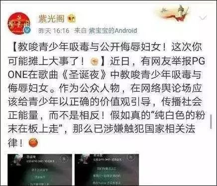 紫光阁登上热搜,源于4日发布的一条微博:“教唆青少年吸毒与公开侮辱妇女!这次你可能摊上大事了!”该微博针对歌手王昊(PG ONE)歌曲《圣诞夜》进行评论,认为“作为公众人物,在网络舆论场应该给青少年以正确的价值观引导,传播社会正能量,而不是相反!假如真的‘纯白色的粉末在板上走’,那么已涉嫌触犯国家相关法律!”此后,该微博引起其粉丝不满,并有人以为“紫光阁”是一家饭店。有该歌手粉丝群截图显示,其粉丝在看到该微博后策划了一场“刷热点”事件,群内有人提到“联系了卖热搜的,明天做一个热搜出来,大家到时候去刷评论”。