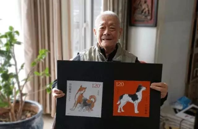 ▲周令钊大师与亲自设计的狗年邮票合影