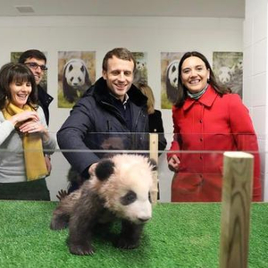 2017年12月16日,法国总统马克龙(前中)在圣艾尼昂市博瓦勒野生动物园看望大熊猫宝宝“圆梦”。(资料图片)