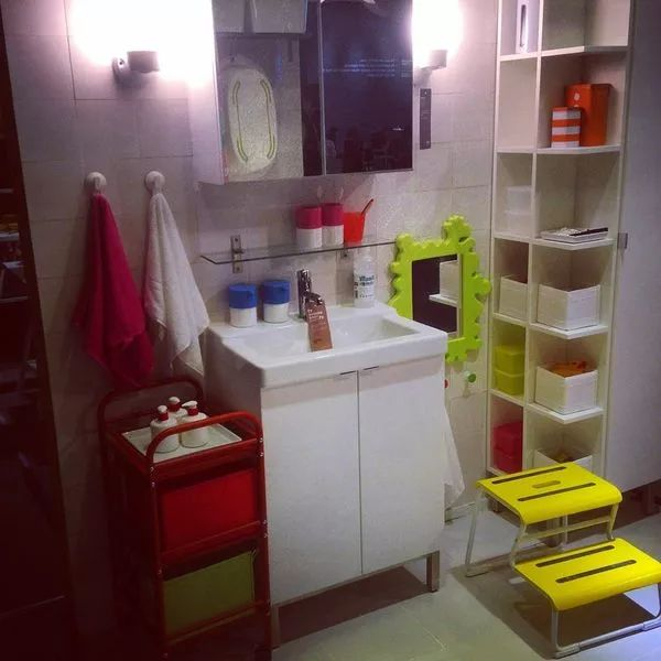 还要看:你没发现看点是两个一大一下高低错落的镜子么,大镜柜爸爸妈妈用,小镜子宝贝儿用,你们终于可以一起对镜贴花黄了,那个黄色的脚蹬也方便宝贝儿自己用爸爸妈妈的洗手池,小脸盆再见。