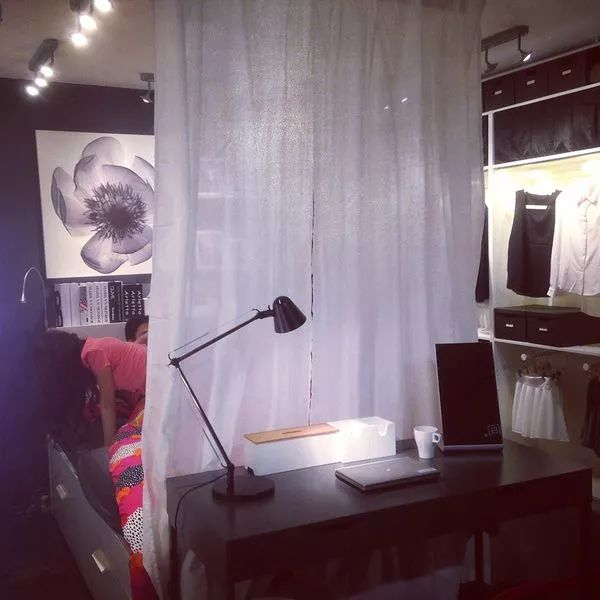 还要看:许多开间融合了不同功能,如何让写字台与床完美共存,这个样板间给出了很好的示范:把写字台放到床尾,用两片纱帘隔开两个区域,然后你获得了舒适的睡眠区,以及干净正经的工作区。