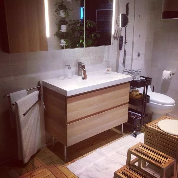 还要看:这个卫生间的自然感是哪儿来的呢?注意,壁柜、洗手池、地板、脚蹬,都是浅原木色的,他们在一起共同营造了自然感。