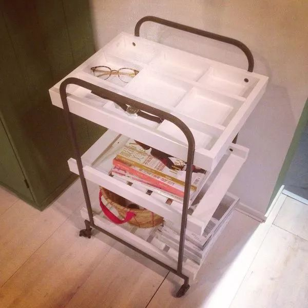 还要看:这个小推车被放在卧室的床边,它基本已经可以让床头柜下岗了,一层有条理的收纳零碎物品,二层、三层放书、杂志以及大件杂物。更重要的是:它能到处移动!