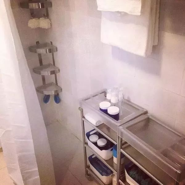 还要看:这其实是一个满足极大收纳需求的浴室解决方案,两组转角壁挂架,两辆耐水溅的不锈钢推车,那些洗澡的时候要用到 100 个瓶瓶罐罐的人,这是你的卫生间。