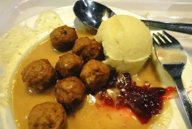 在宜家美食中排名第二的瑞典肉丸,10粒15.5元,瑞典传统配方,肉丸、越橘果酱、瑞典肉丸汁配煮马铃薯,肉丸非常有弹性呢,一口咬下去,还有淡淡的奶香味。