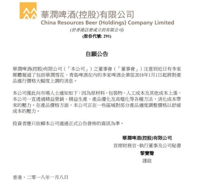 青岛啤酒发布公告称,由于公司2018年面临包装材料价格上涨,生产成本增加等压力,本公司拟对部分区域的部分产品进行价格上调,并非全部产品,以部分消化成本上涨压力,拟涨价部分产品的平均涨价幅度不超过5%。