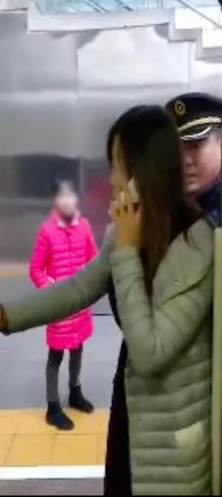 原来,一名身穿灰色羽绒服的女子用手和身体抵住车门,一边阻拦高铁发车,一边打电话。