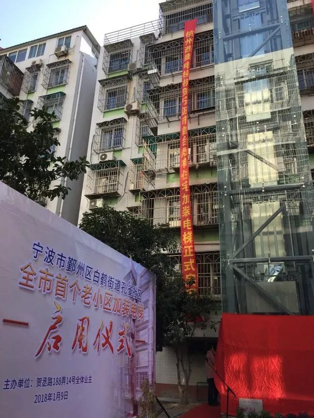 2017年11月9日,鄞州区白鹤街道孔雀小区贺丞路188弄14号单元楼加装电梯开始施工,这是宁波市首个电梯加装试点项目。转眼两个月过去,电梯终于启用,楼里居民欣喜若狂。