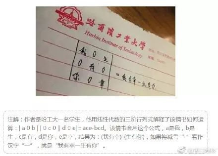 【不好好学习连情书都看不懂了!00后的恋爱表白,脑洞大开】根据一学期的地理知识,撰写三行情书。布置这份作业的老师感慨:每个孩子都是创造者,可以将枯燥的课本知识,创造成情感饱满的诗歌。这样的诗歌,也让老师和家长有一个途径更加走进孩子的心境。据说,除了地理,学生们还流行用数学、化学写情书。