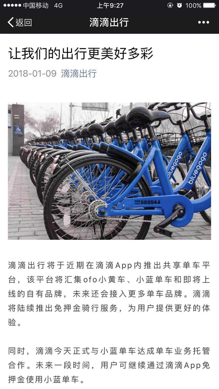 1月9日,滴滴单车发布消息,于当日正式与小蓝单车达成单车业务托管合作,同时透露的还有,滴滴自有单车品牌即将上线。