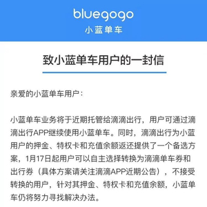 根据托管安排,小蓝单车的品牌、押金和欠款等各项事务仍归属于小蓝公司。滴滴将提供“小蓝单车APP用户押金、特权卡及充值余额可转换为等值滴滴单车券和出行券”的备选方案,1月17日起用户可以自主选择转换(具体方案请关注滴滴APP近期公告),或继续与小蓝公司沟通协商其他解决方案。