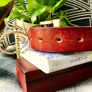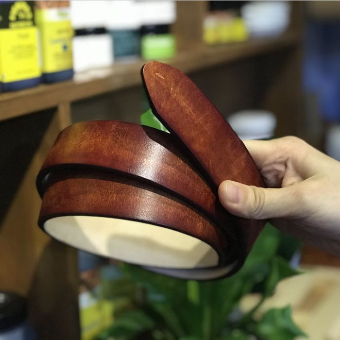 2、材质:汐迟工坊手工制作的皮带选用意大利进口原色植鞣带条,厚度3.8~4.0mm,男带38mm宽,女带35mm宽。原色头层牛皮,手工擦色,颜色多样,提供基础纯铜实心带头,也可自备带头。