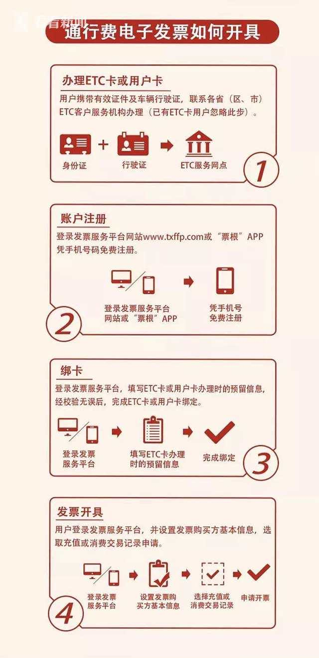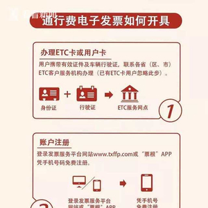 ETC卡或用户卡的客户,可到发票服务平台(www.txffp.com)或“票根”APP进行账户注册,绑定ETC卡或用户卡,完成身份认证。当需要开具电子发票时,登录发票服务平台,选取需要开具发票的充值或消费交易记录,即可申请生成通行费增值税电子发票。