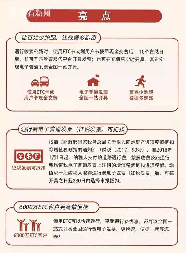 记者从市路政局了解到,2018年1月1日起,本市高速公路通行费可开具增值税电子发票。用户使用ETC缴纳高速公路通行费或充值费,可通过全国统一的发票服务平台开具通行费增值税电子普通发票,并实现税款抵扣。