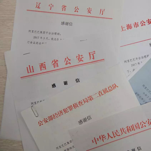 据不完全统计,2017年以来,阿里巴巴平台治理部共收到来自公安、质监、工商、食药监等政府部门的各类感谢信近40封。其中,来自公安机关的书面感谢信多达30封,包括公安部及10个省市公安部门。另外,质检总局、海关总署乃至全球海内外品牌权利人也齐齐为阿里点赞,达到百次。