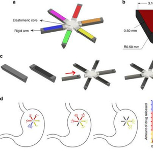 研究团队最早开发这一给药系统是在2016年。当时的胶囊为由六个载药臂组成的星型结构,这些臂向内折叠,有一层光滑的涂层保护包裹。胶囊一旦被吞下后,这些载药臂会打开,逐渐释放药物。研究人员用老版的给药系统研究发现,这些胶囊可以在胃里停留长达两周的时间,逐渐释放疟疾药物伊维菌素。