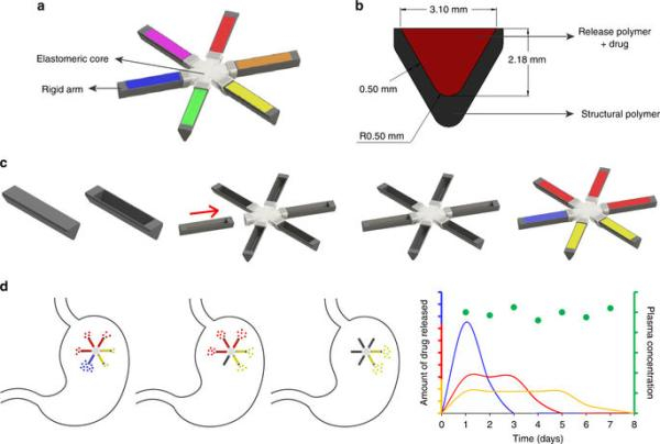 值得注意的是,在最初的设计中,整个星型结构由同一种聚合物来提供支撑和载药。这一点的不足之处在于难以设计新的可以以不同速率释放不同药物的胶囊,因为聚合物成分稍有改变就会破坏胶囊结构的完整性。
