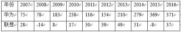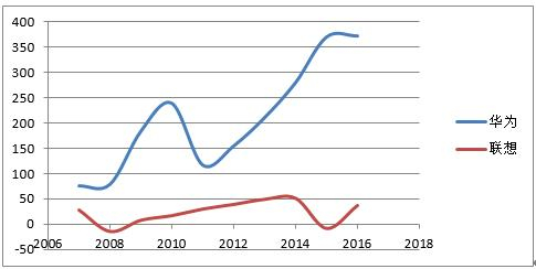 而由表2和图2可知,2007年以来,华为的净利润虽然波动幅度更大,但是一直在70亿元以上,且经过2011年的低谷后一直是稳定快速的上升。而联想10年来最高的净利润只有51亿元,且2008年和2015年出现了亏损。不仅如此,2017年8月18日,联想再次传来亏损的“坏消息”,截至2017年6月30日的第一财季报告显示,营收100.12亿美元,与去年同期持平;集团亏损7200万美元;毛利率同比减少1.7%至13.6%。