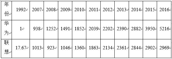 联想成立较华为早3年,在早期明显比华为有先发优势。由表1和图1可知,华为在1992年销售额才超过1个亿,甚至于因为销售突破1个亿,任正非在年终大会上,哽咽着说出“我们终于活下来了”。而联想1992年销售额已经达到17.67亿元,是华为的17倍多。而从2008年开始,华为的销售收入正式超过联想,到2016年,华为的销售收入已经是联想的1.7倍,发展速度之迅猛让联想望尘莫及。