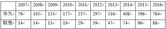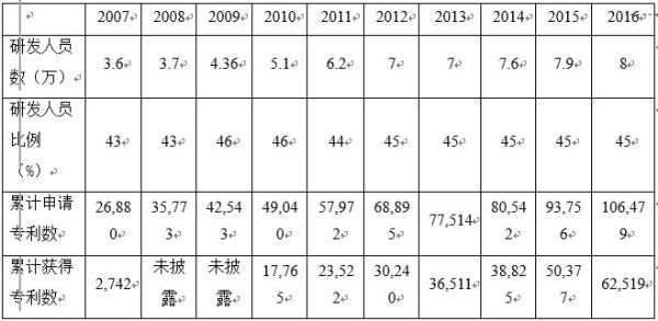 表4 2007-2016年华为研发人员和专利情况统计