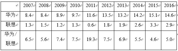 而相比之下,联想的研发投入则相形见绌。在过去10年中,联想在研发方面的总投入不及华为的1/7,华为的研发投入无论是从绝对数还是相对数(研发费用率)上,各年一直远高于联想。从绝对数上看,由图3和表5可知,2007年,华为的研发投入是79亿元,是联想的5.6倍,而到2016年这一比例已经扩大到8.7倍,且至今联想的研发投入没有破百亿元。从相对数上看,由表6可知,华为的研发费用率至少是联想的5倍,2011年甚至达到了19.3倍。