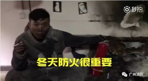 即便如此,他仍一手拿着灭火器,一手叼着香烟,一脸轻松微笑地说了一段话:“这件事情告诉我们一个道理,冬天防火很重要,还有就是笑着面对所有一切。”