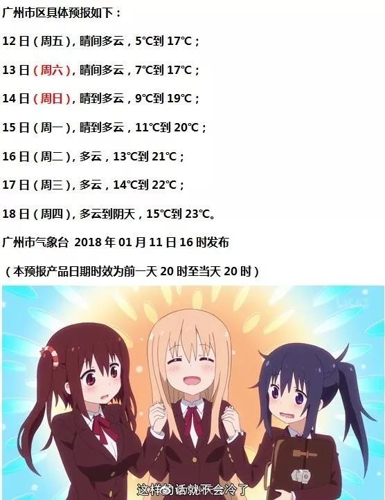 全省的情况如何呢?据省气象台预计,12-13日,粤西市县多云,其余市县晴天到多云,早晨粤北和珠江三角洲北部市县、粤东部分市县有5℃以下低温,高海拔山区-2℃左右,粤北大部分市县和珠三角的部分市县有霜(冰)冻。14日,东部市县晴到多云,其余市县多云。气温回升,全省大部分市县最低气温在5℃以上。