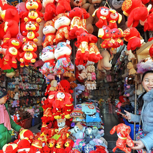 农历狗年将至,昨日,汉正街小商品市场里,各款卡通狗元素的玩偶、贴画等纷纷上市,挂在店铺的醒目位置,吸引不少市民前来选购。一家街边小店里,就有五六十多种狗狗玩偶。记者苗剑 摄