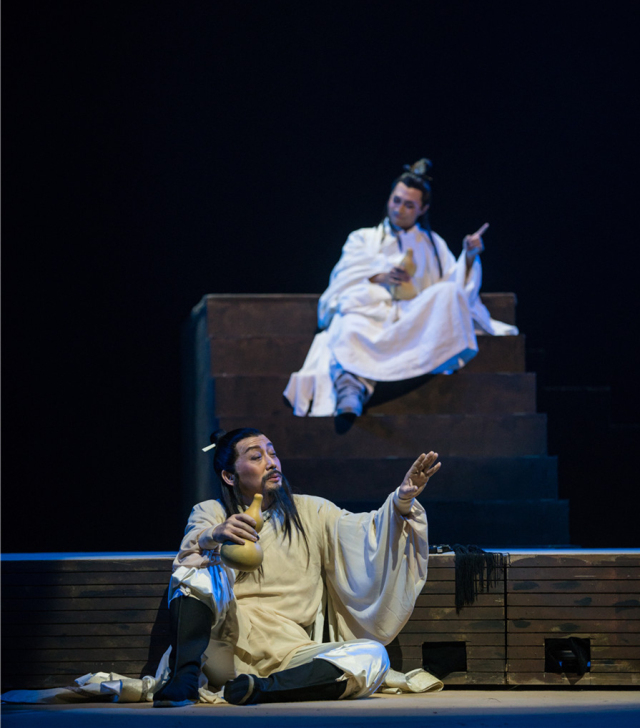 因此,《广陵散》并没有变成嵇康的“独角戏”,而是通过对魏晋时期士人群像的描摹展现一个关于抉择的故事。剧中人物无不面临着身不由己与不可抗争的冲突——嵇康不肯向权贵低头,慷慨赴死;阮籍与阮咸纵情诗酒,不肯为官;王戎、山涛迫于压力投靠司马氏;向秀在嵇康被杀后,不得不应征到洛阳;刘伶隐居避世……将人性的善与恶、勇敢和脆弱全部摊开给观众看,让观众通过舞台反观自身,找寻属于自己的“角色”与抉择。