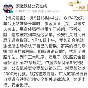 1月5号下午,由蚌埠南开往广州南站的G1747次列车,正在合肥站停站办客时,女子罗某因丈夫没有上车,强行扒阻车门,导致列车晚点。