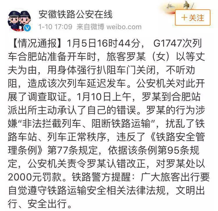 下午5点09分,合肥铁路公安处官方微博“安徽铁路公安在线”发通报称,对罗某罚款2000元。