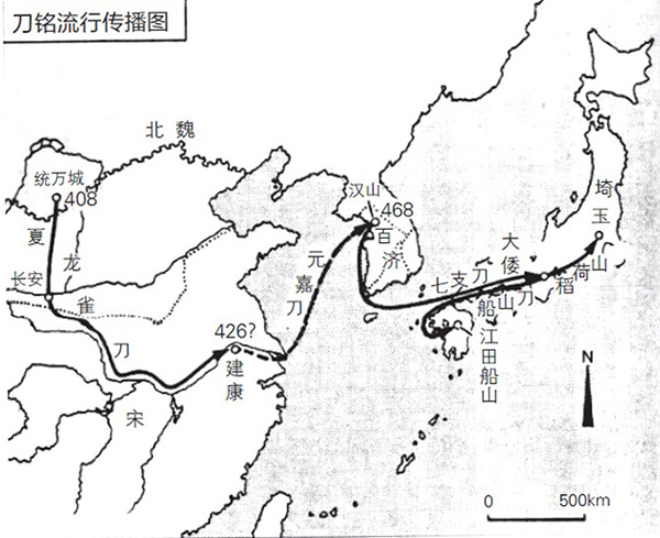 另一方面,宫崎虽以七支刀作为切入点,但其目光并没有停留于七支刀本身,而是在广阔的东亚世界中寻找长文刀铭的源头和流布,这样的尝试在学界是绝无仅有的。作者认为,西夏赫连勃勃的龙雀刀以南北朝的争战为契机传入南朝,成为元嘉刀的原型。百济与南朝通好,元嘉刀铭文又深刻影响了七支刀铭文的书写。七支刀经由百济太子传入倭国,带来了长文刀铭的风俗,于是有了后来的稻荷山铁刀铭文和江田船山大刀铭文。正如宫崎在文中所感叹的:“五世纪的古代,长文刀铭起于万里长城之外、内蒙古沙漠中的游牧王朝首都,经过刘宋创业英主刘裕之手传入江南佳丽之地、南朝国都,接着又渡海来到百济,承载着年轻王子永远的心愿再次渡海到达日本,最后在近畿分成两路,一支到达埼玉,一支赶赴熊本。以上路径皆由刀剑本身自然形成,单凭这一事实就堪称一首无须润色、弘扬壮丽梦想的浪漫史诗了。”通过这一路线的勾勒,本书的研究对象不再只是作为“物”的七支刀,而是将“人”的活动也纳入了考察的范围。