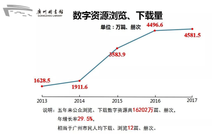 数字平台拓展服务为适应数字化技术的发展,近年来广图也加强了数字图书馆的服务,从数字资源下载量来看,5年来从2013年的1628.5万篇、册次增长至2017年4581.5万篇、册次,增幅达281%。