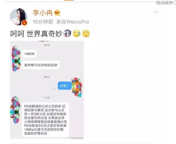 耿直的李小冉大概忘了自己是个女明星,听说pgone花了1400万在做公关,竟然直接将微博流传的公关截图发了出来,并配文“呵呵,世界真奇妙”。