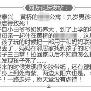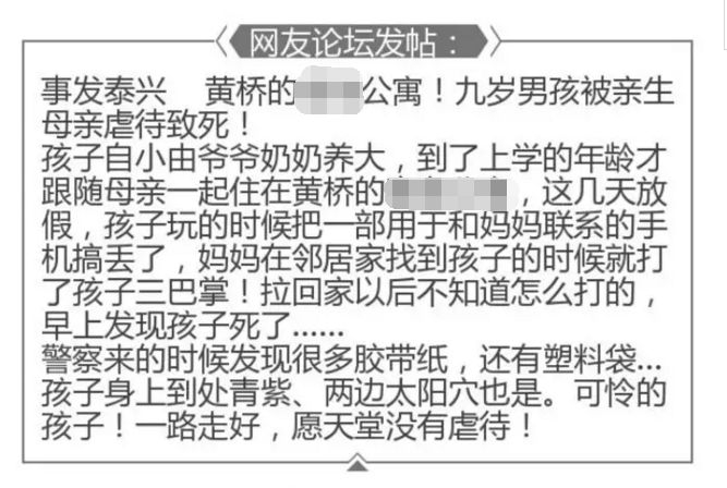 “江苏黄桥某公寓一母亲将9岁亲生儿子打死了,疑因孩子把手机弄丢了。”前两天,有网友爆料称,一个9岁的男孩被亲生母亲打了一顿后不幸身亡。