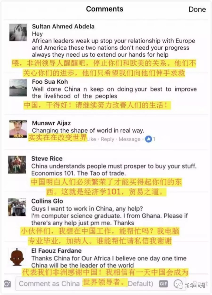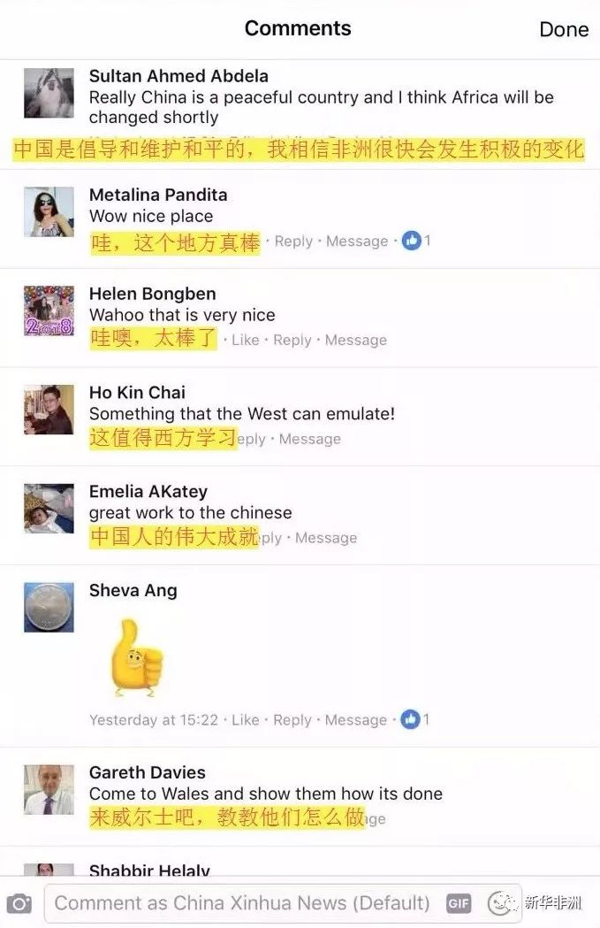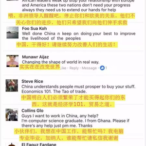 当地人及外国人怎么看中国企业在非洲做的这些项目呢?我们把这些项目图片和信息发在新华社的脸谱和推特账号上,他们的反应是这样的: