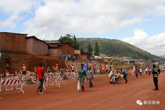 2017年5月2日,在卢旺达首都基加利,行人走在正在实施改扩建工程的道路上。新华社记者 吕天然摄