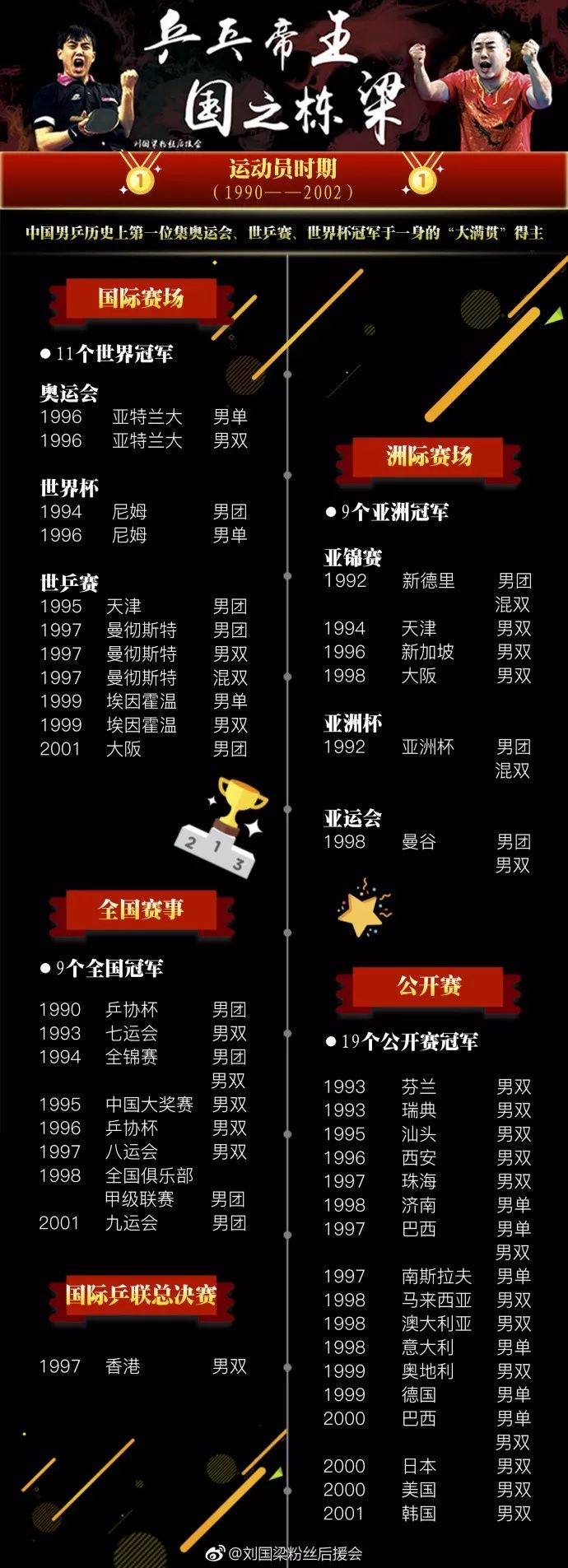 1996年亚特兰大奥运会,刘国梁收获男双金牌和男单金牌。当年他还获得了第17届世界杯男子单打冠军。