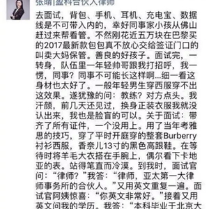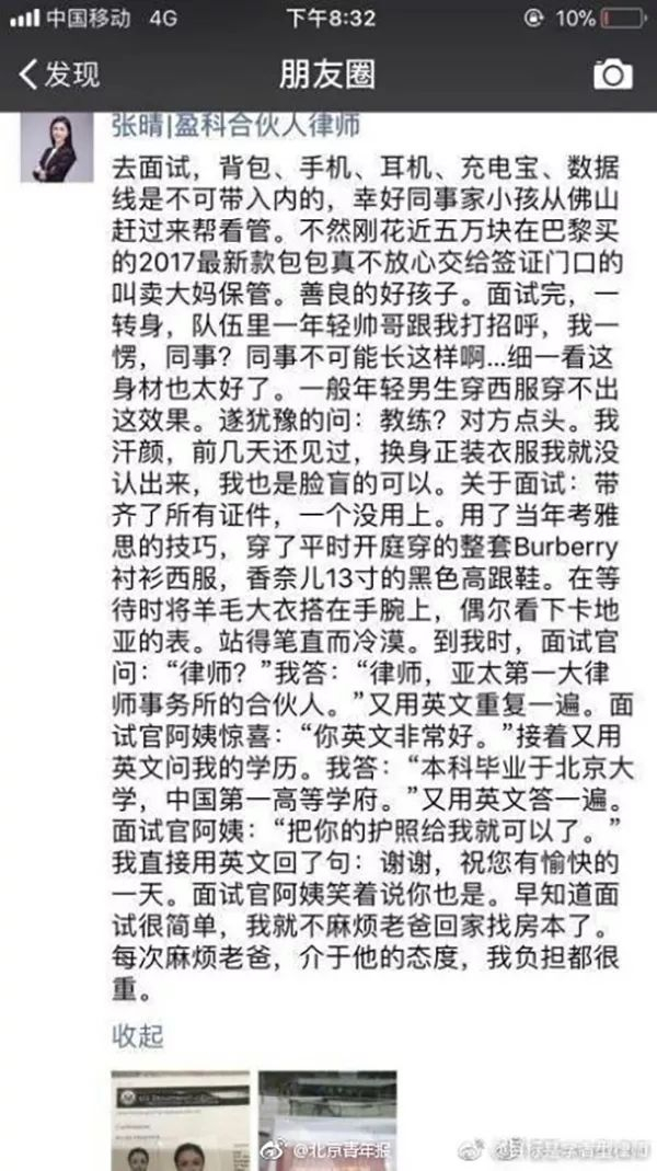 发表这番言论的是自称“北京市盈科律师事务所合伙人的律师张晴” ,最开始流传的,是下面这张截图:张晴,本科毕业于北京大学,是盈科律师事务所的合伙人。