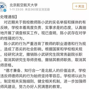1月1日下午,北京航空航天大学发布通告称,学校一直高度重视近期社交网络媒体关于我校教师陈小武师德师风的问题反映及实名举报,第一时间成立了工作组,迅速开展调查核实,并已暂停陈小武的工作。北京航空航天大学对违反师德师风的行为零容忍,有关情况一经查实,将坚决严肃处理,绝不姑息。