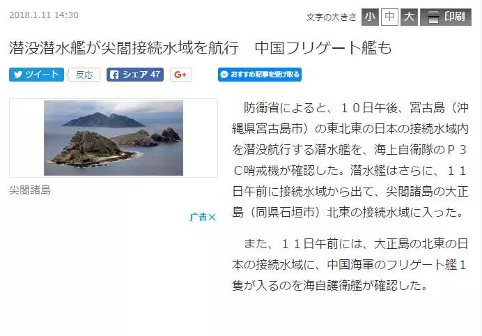 据日媒报道,日本政府1月11日下午发布消息称,有中国潜艇和军舰进入钓鱼岛赤尾屿东北方向毗邻海域。日本首相安倍晋三已向各省厅下达指令,要求全力做好警戒监视工作。这是中国军舰自2016年6月后,第二次进入该海域。