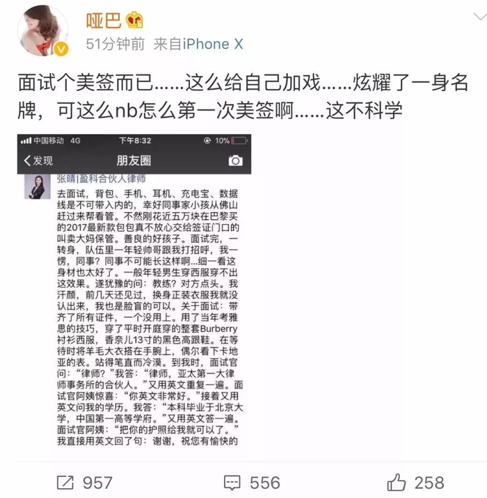 这位处在舆论风口的女律师,马上就荣获了“炫富律师”称号。有网友说她是律师界的霸道总裁,也有网友说她刻薄又肤浅!还有网友戏称,这个张晴是一个被律师耽误了的作家!
