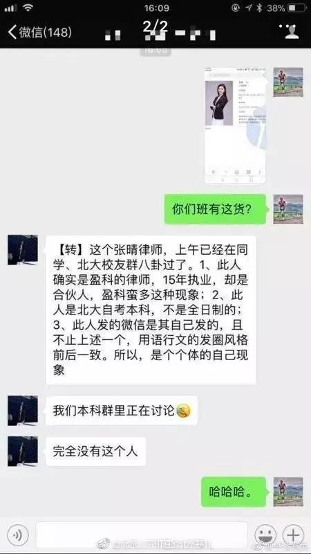 关于学历问题,有媒体记者曾致电北京大学法学院,工作人员回复称,目前能确认的是张晴并非该校法学院学生,“但是否是网传的北京大学自考或函授学历,尚未证实”。