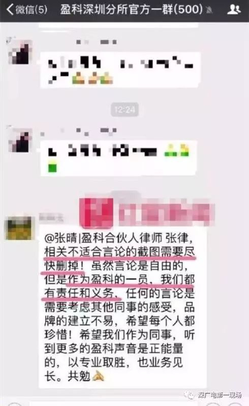 而后,网上流出疑似“盈科深圳分所官方一群”的聊天截图中,有群友要求张晴将“相关不适合言论的截图需要尽快删掉”。