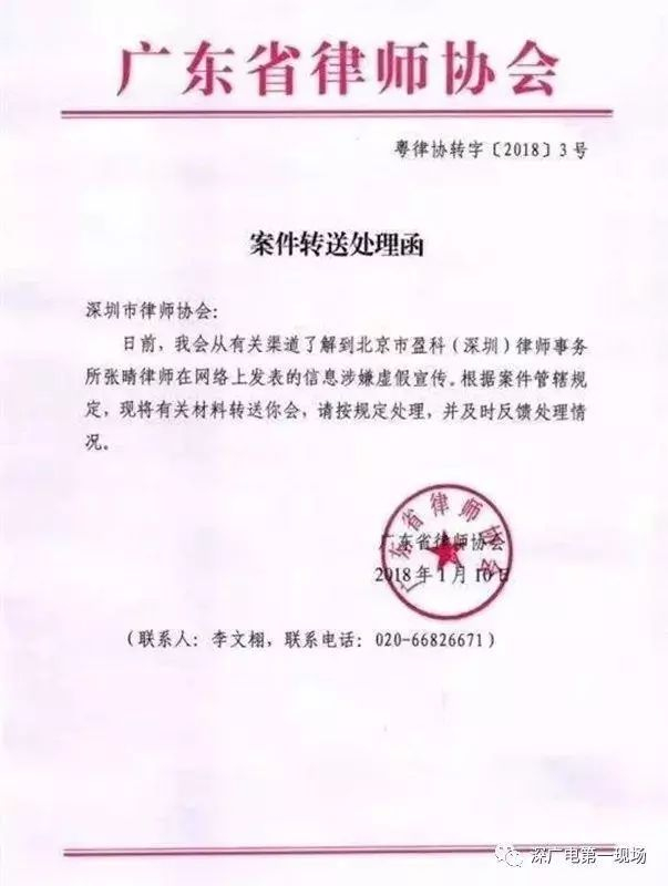1月10日,广东省律师协会向深圳市律师协会发送了一份案件转送处理函,表示从相关渠道了解到张晴律师在网上发表的信息涉嫌虚假宣传,根据案件管辖规定, 请深圳市律师协会按照规定处理,并及时反馈处理情况。