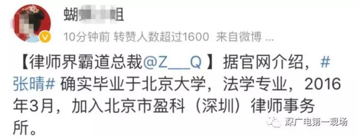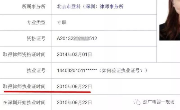 有记者查询深圳市律师协会官网和盈科律师事务所官网后发现,这名张晴确实是盈科律师事务所深圳分所的持证律师,毕业于北京大学法学专业,加入律所的时间是2016年前后,目前的职位是专职律师。