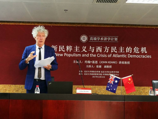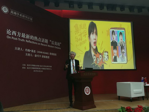 我在2017年12月11日第一次见到约翰·基恩。“后真相”是他这天应邀在北大“高端学术论坛”演讲的题目,他身形高大、一身剪裁合身的黑色西服,系着一条明艳的领带,花白的鬈发引人注目。他用不太标准的中文问候听众,演讲配有恰到好处的幻灯片,其中穿插特朗普的搞笑视频、网红papi酱的照片——他显然知道在什么时候进行严肃的思辨、什么时候调节听众紧绷的大脑。之后,他回答了观众们的提问,每个问题都用了超过五分钟去解答——甚至显得过于认真。